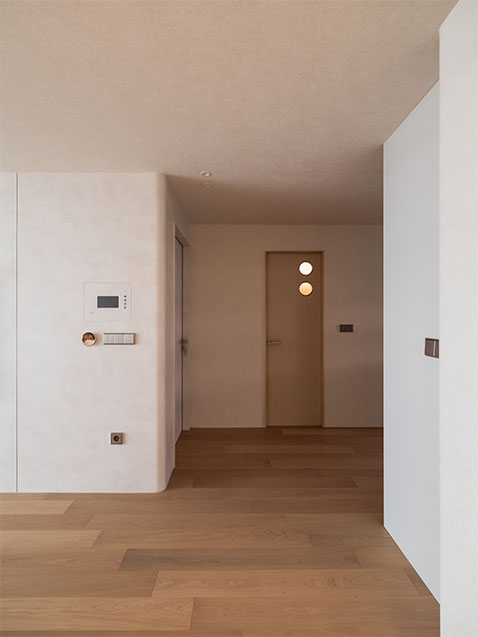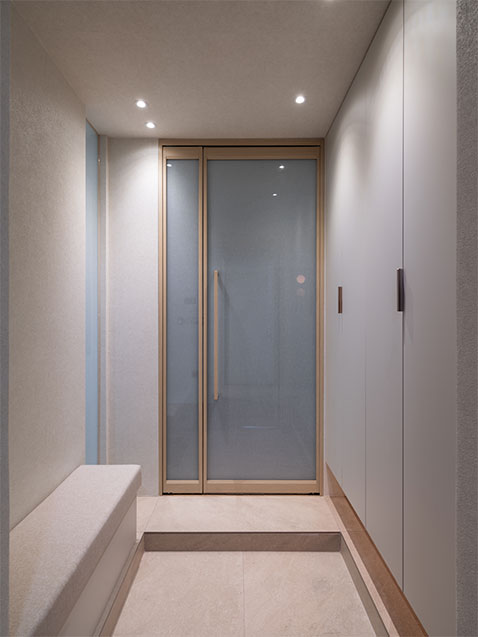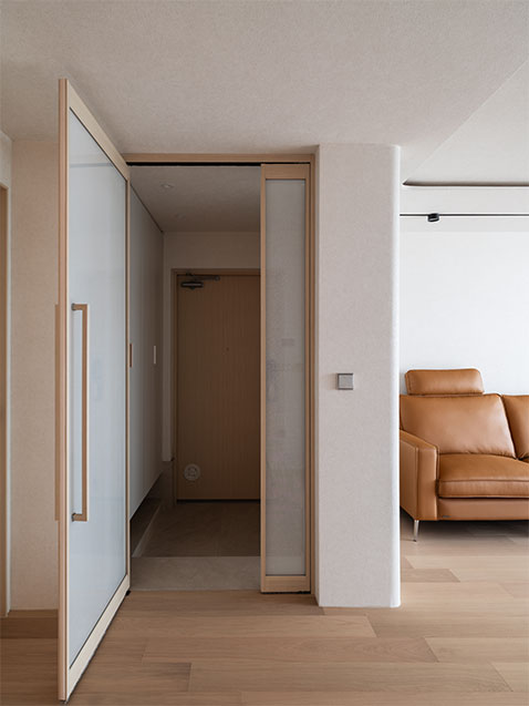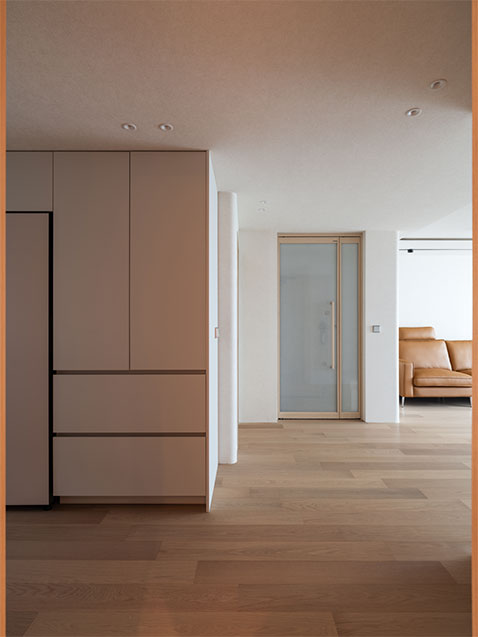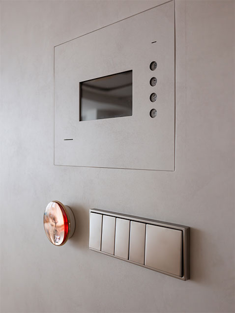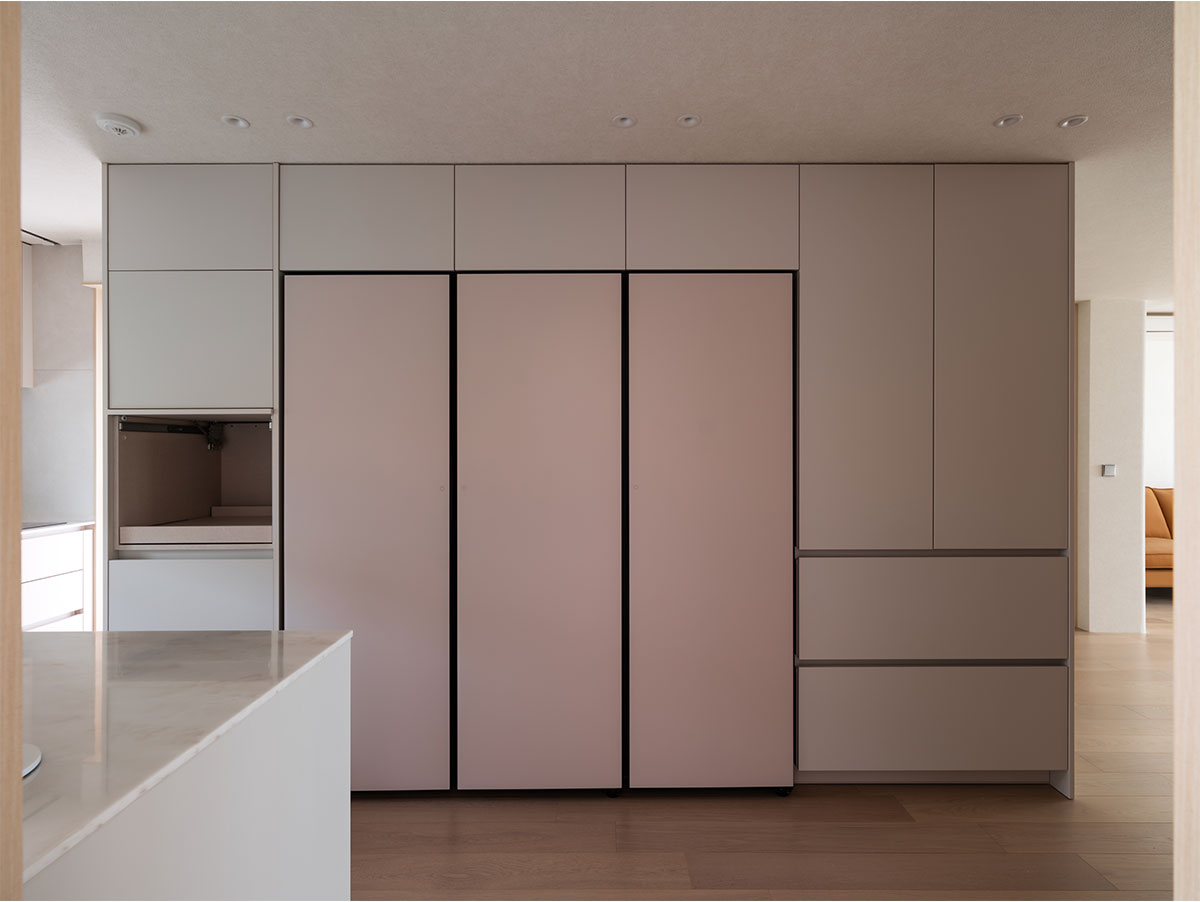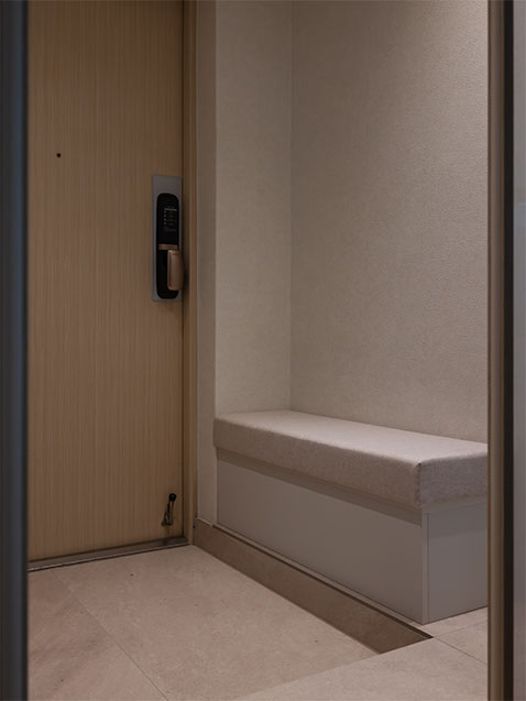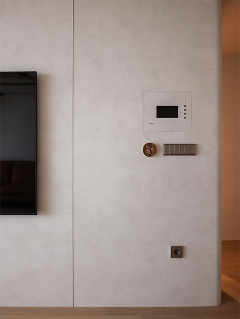디테일에서는 기능적 요소와 조형적 완성도를 동시에 추구했다. 스틸 재질의 프레임 속에 융콘샌트(콘센트)와 인터폰을 매립·일체화하여, 불필요한 돌출 없이 깔끔하게 마감하였다. 이는 오래된 아파트 특유의 낡고 단절된 인상을 최소화하고, 현대적인 정제미를 구현하는 중요한 장치로 작용한다.