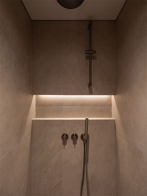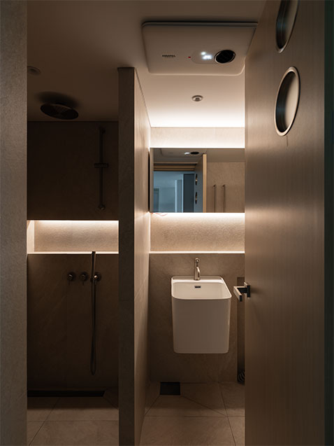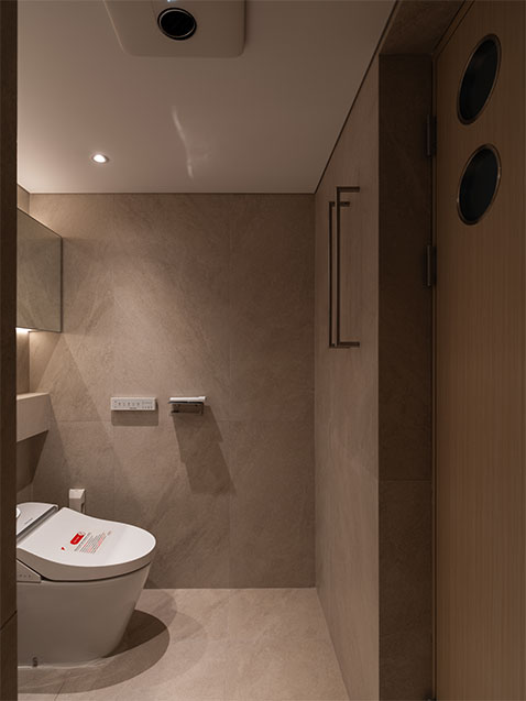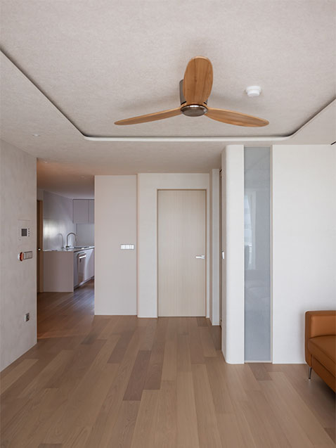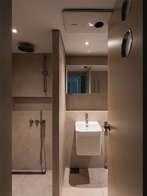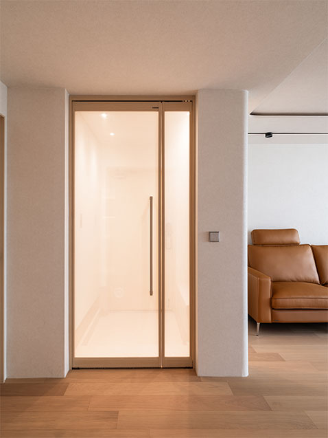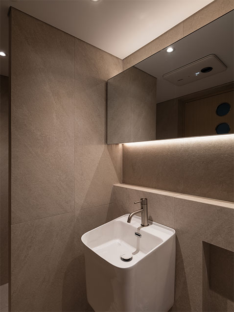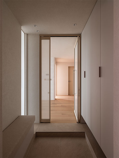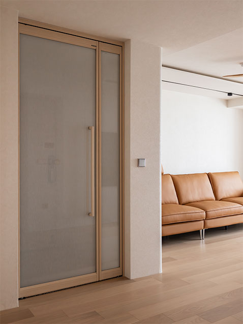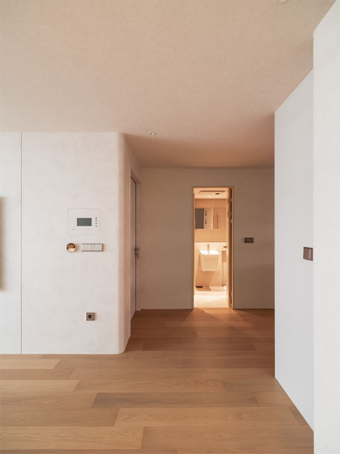 디테일에서는 기능적 요소와 조형적 완성도를 동시에 추구했다. 스틸 재질의 프레임 속에 융콘샌트(콘센트)와 인터폰을 매립·일체화하여, 불필요한 돌출 없이 깔끔하게 마감하였다. 이는 오래된 아파트 특유의 낡고 단절된 인상을 최소화하고, 현대적인 정제미를 구현하는 중요한 장치로 작용한다.