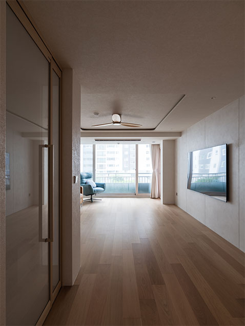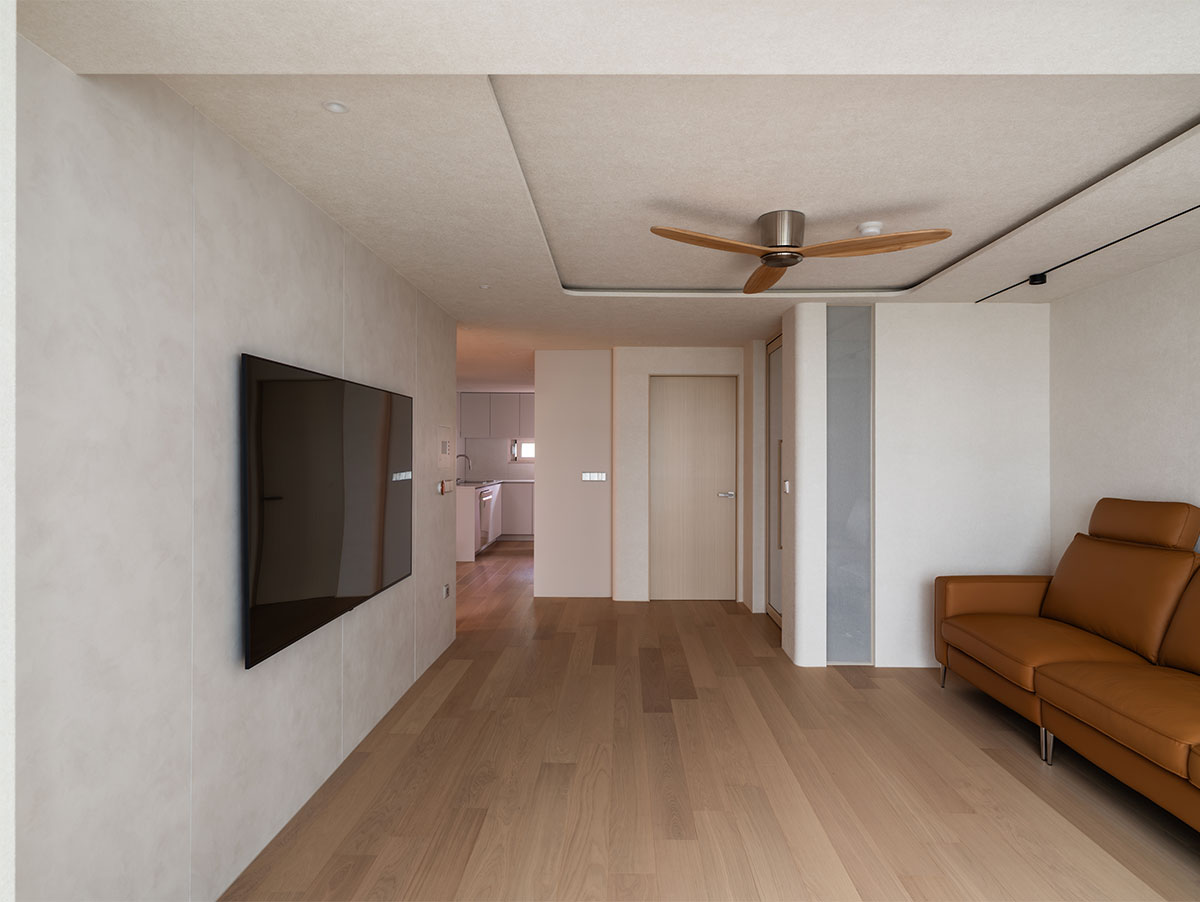 전체적인 분위기는 절제와 따뜻함의 균형 위에 설계되었다. 벽면은 디아망 벽지의 섬세한 질감을 활용하여 단조로운 평면에 깊이감을 부여하고, 은은한 질감이 자연스럽게 빛을 받아내어 공간을 한층 풍요롭게 만든다. 바닥은 원목 마루를 사용해 시각적 따뜻함과 물리적 안정감을 동시에 제공하며, 바닥이 공간 전체를 감싸 안는 듯한 인상을 주어 머무는 이에게 편안함을 준다.