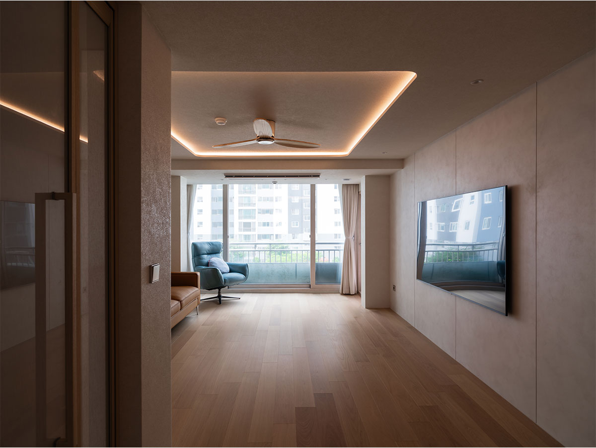 따뜻한 재료와 차가운 재질의 조화, 은은한 질감과 단단한 선의 대비는 이 아파트를 단순한 리모델링 그 이상의 공간으로 만든다. 오랜 시간이 켜켜이 쌓인 장소에 새로운 숨결을 불어넣어, 거주자가 몸과 마음을 온전히 내려놓을 수 있는 ‘포근한 집’의 의미를 회복했다