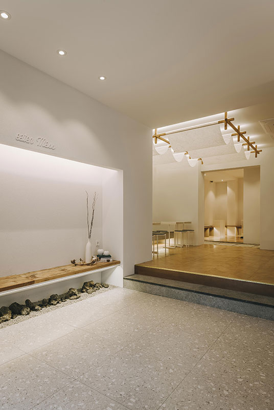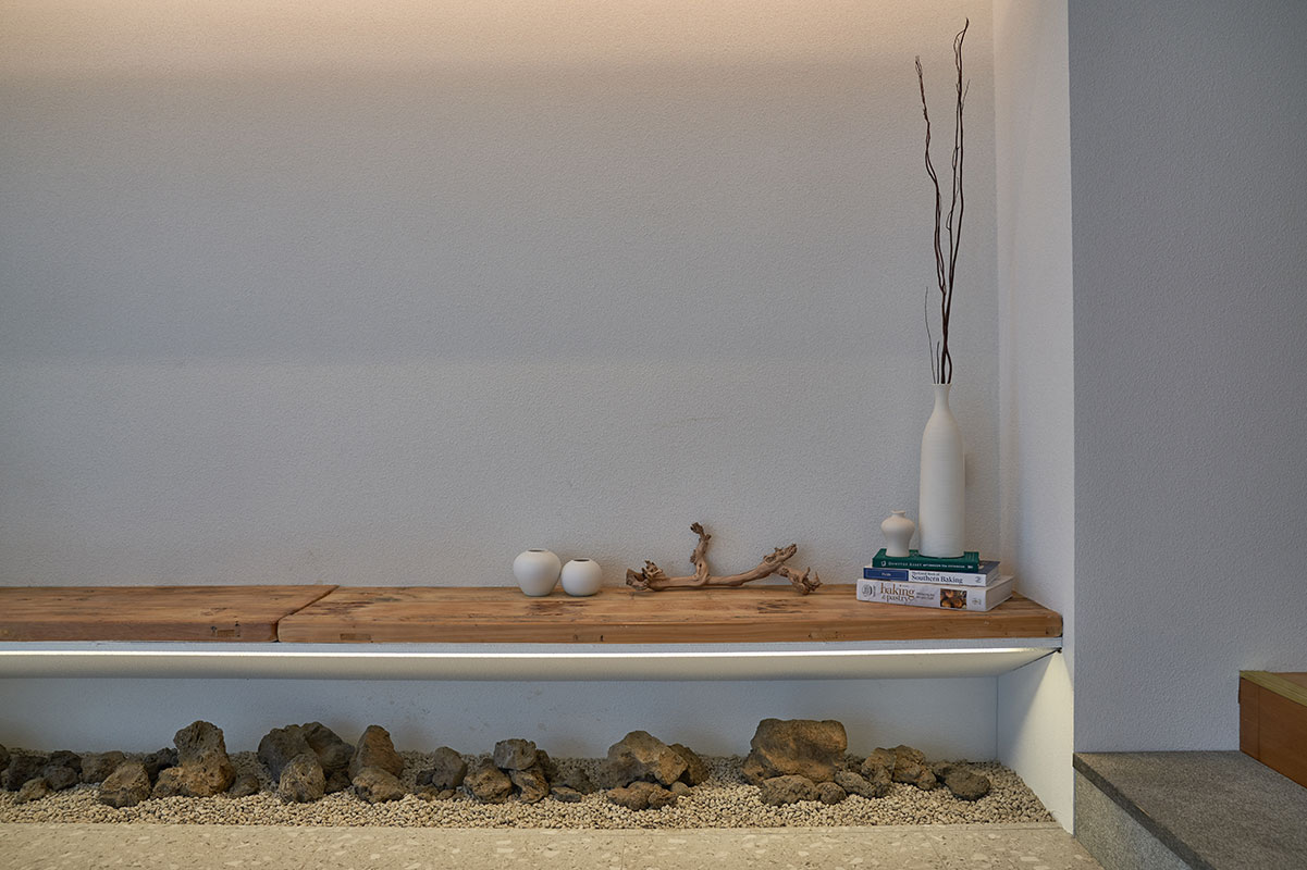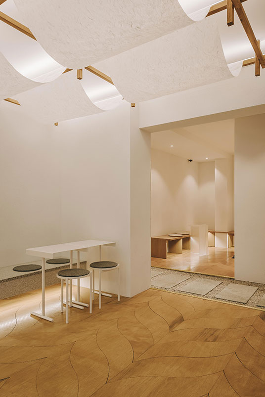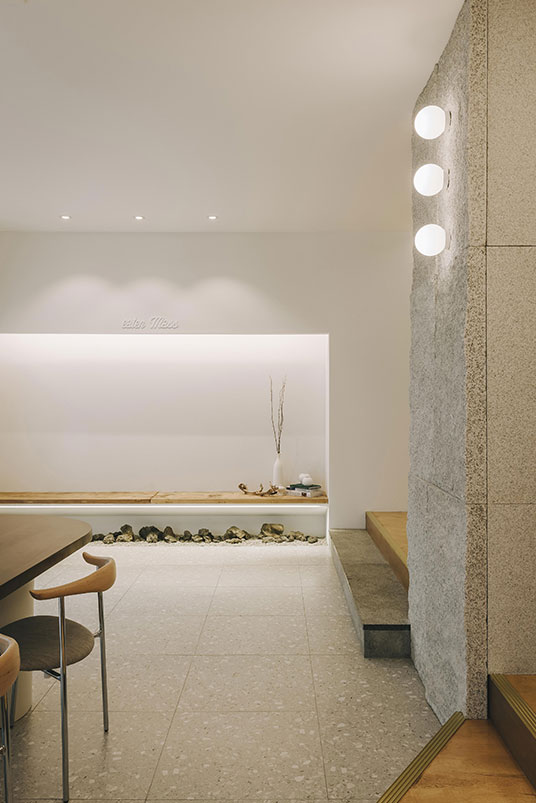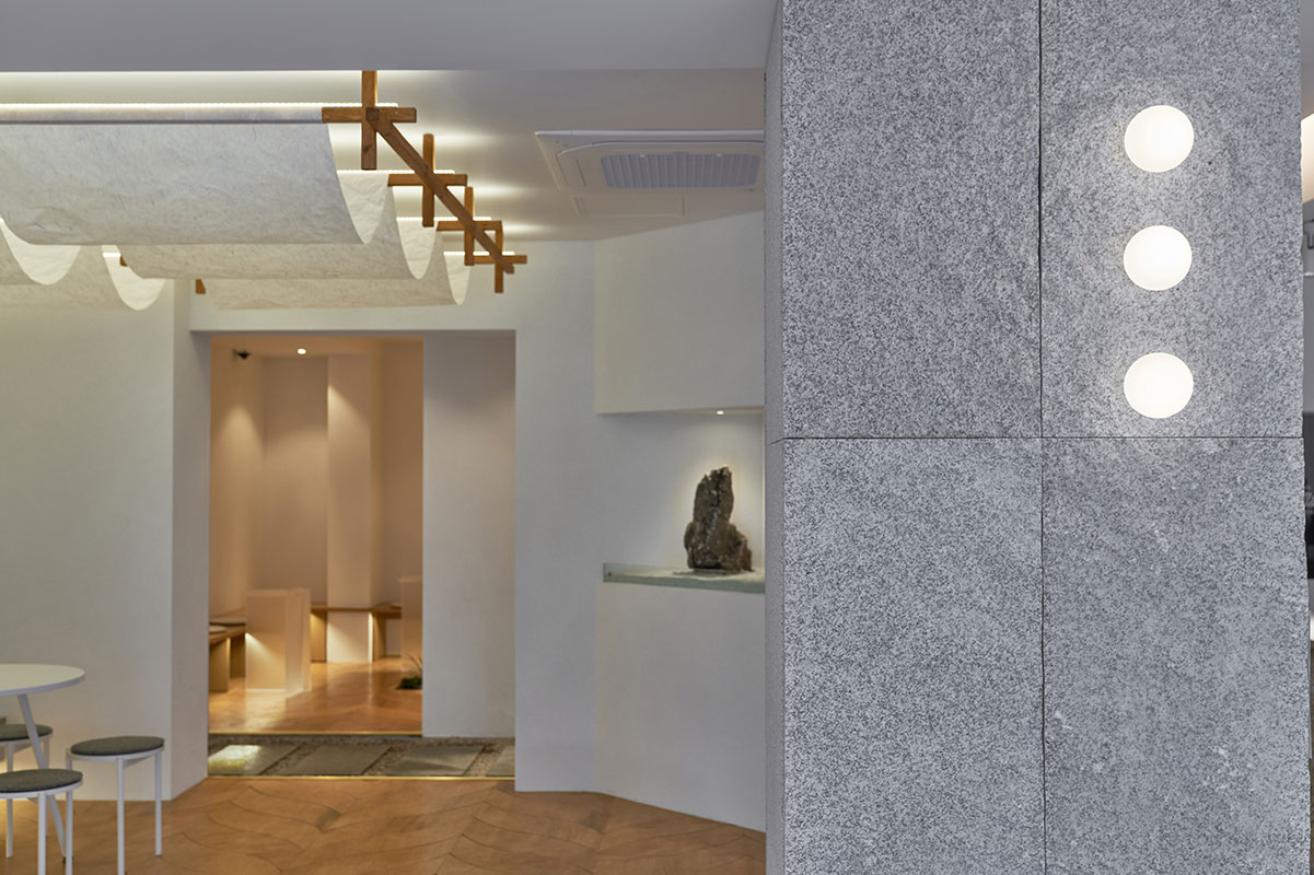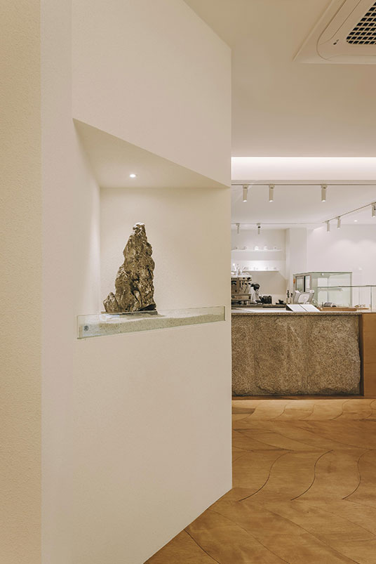 우드와 포천석이 주된 마감재로 컬러의 단순화를 시켜 진행된 공간이었다. 바닥 마감재는 기성 마루 제품을 사용하지않고 CNC로 직접 제작하여 시공하였다.