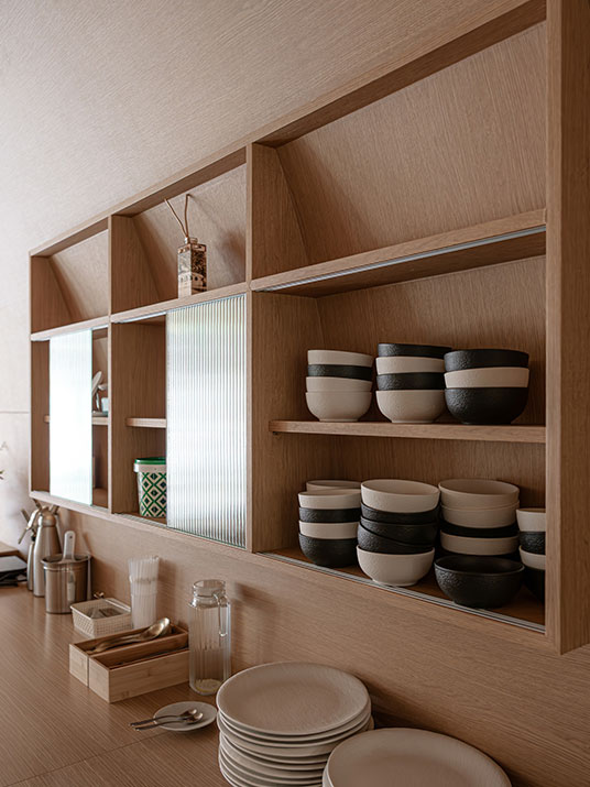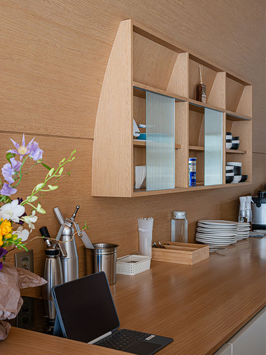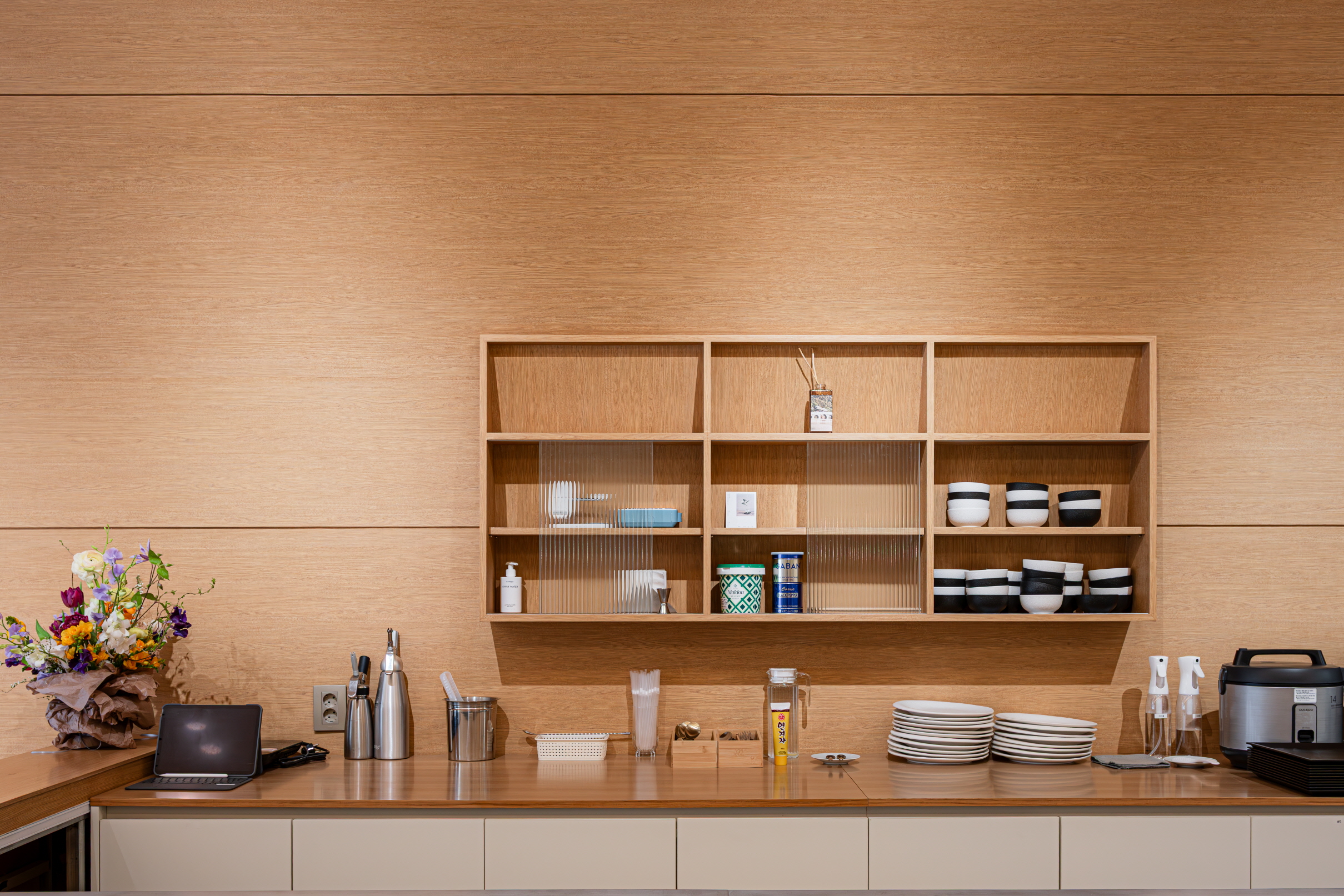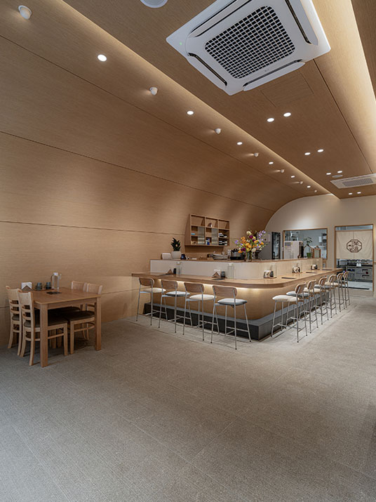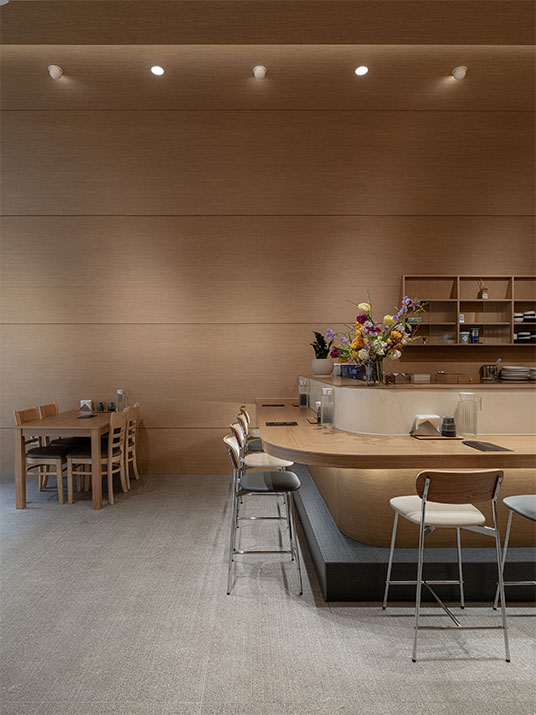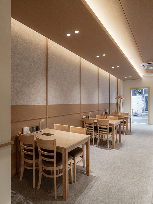 내추럴 오크 톤의 마감재는 일본식 카츠 브랜드의 정갈하고 조용한 무드를 현대적으로 해석한 것입니다.