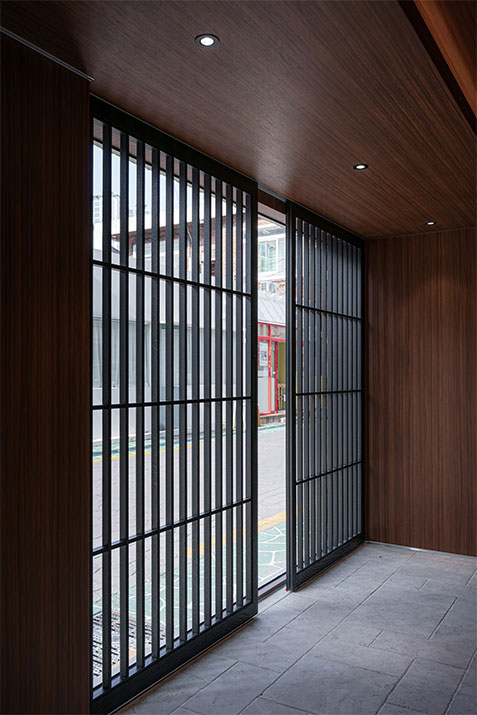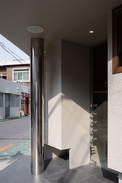 바닥 및 일부 벽면에는 불규칙한 패턴의 타일 시공을 적용하여 단조로움을 피했습니다. 하지만 무질서해 보이지 않도록 패턴의 흐름을 조절하여 감각적인 조화를 이루도록 했습니다. 이로 인해, 공간이 정적인 느낌에 머물지 않고 자연스러운 리듬감을 가질 수 있도록 디자인했습니다.