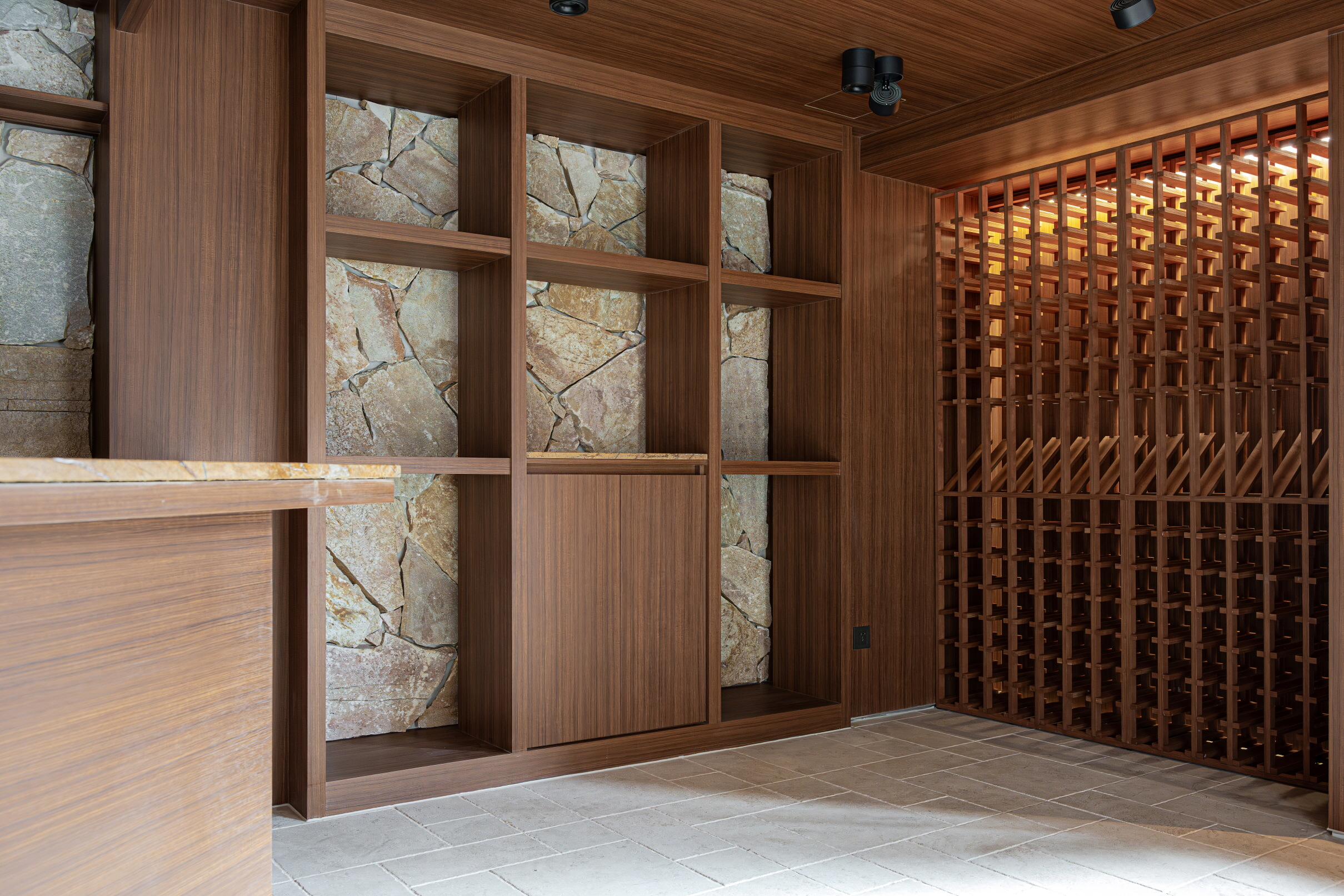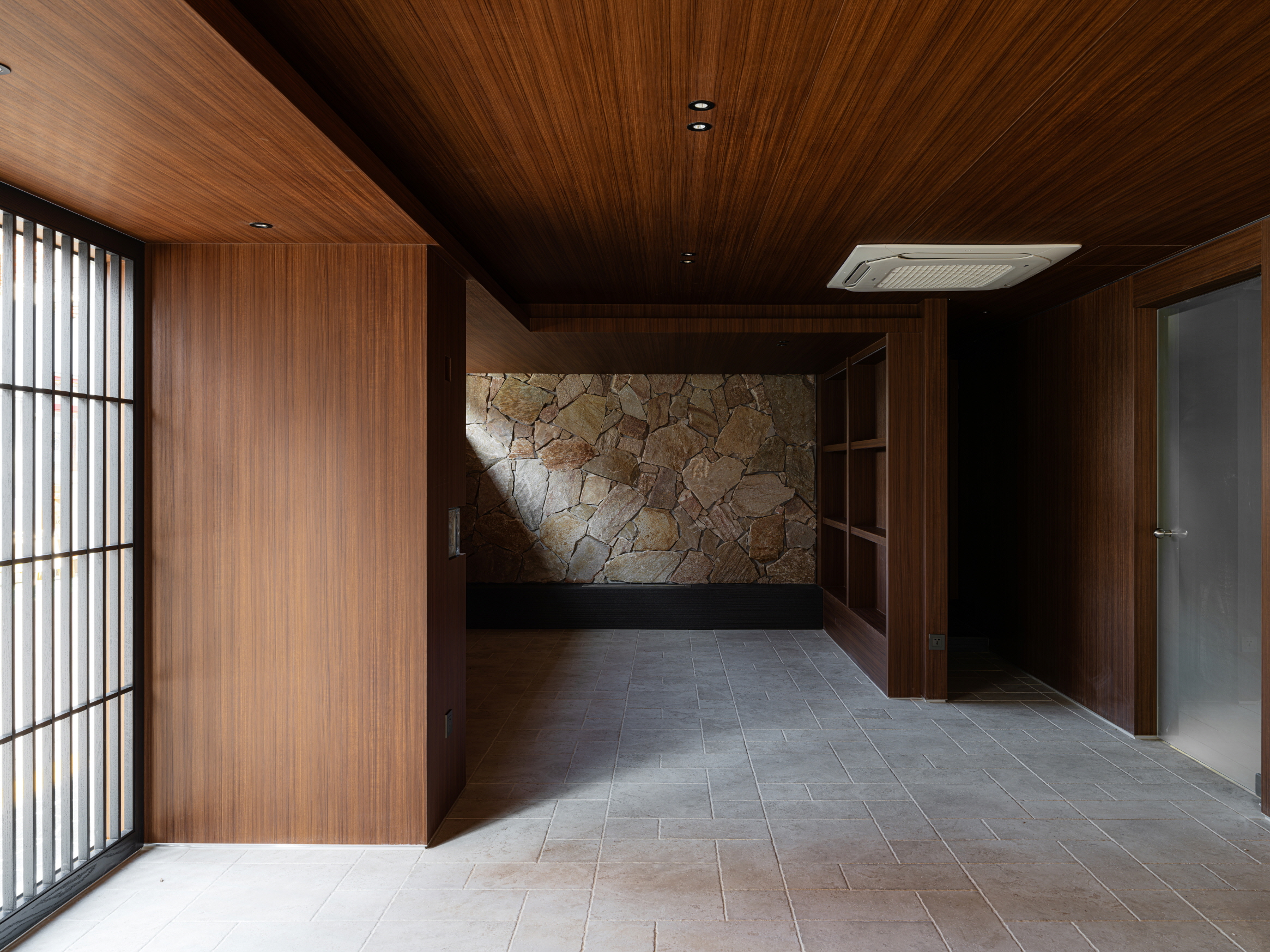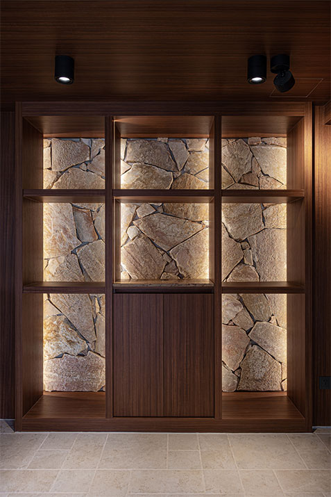 벽체와 일부 마감재에는 거친 질감의 석재(파석)를 적용해 공간에 자연스러운 텍스처를 더했습니다. 이 소재는 조명에 따라 다른 분위기를 연출할 수 있어, 시간대에 따라 달라지는 공간의 변화를 더욱 극대화하는 역할을 합니다.