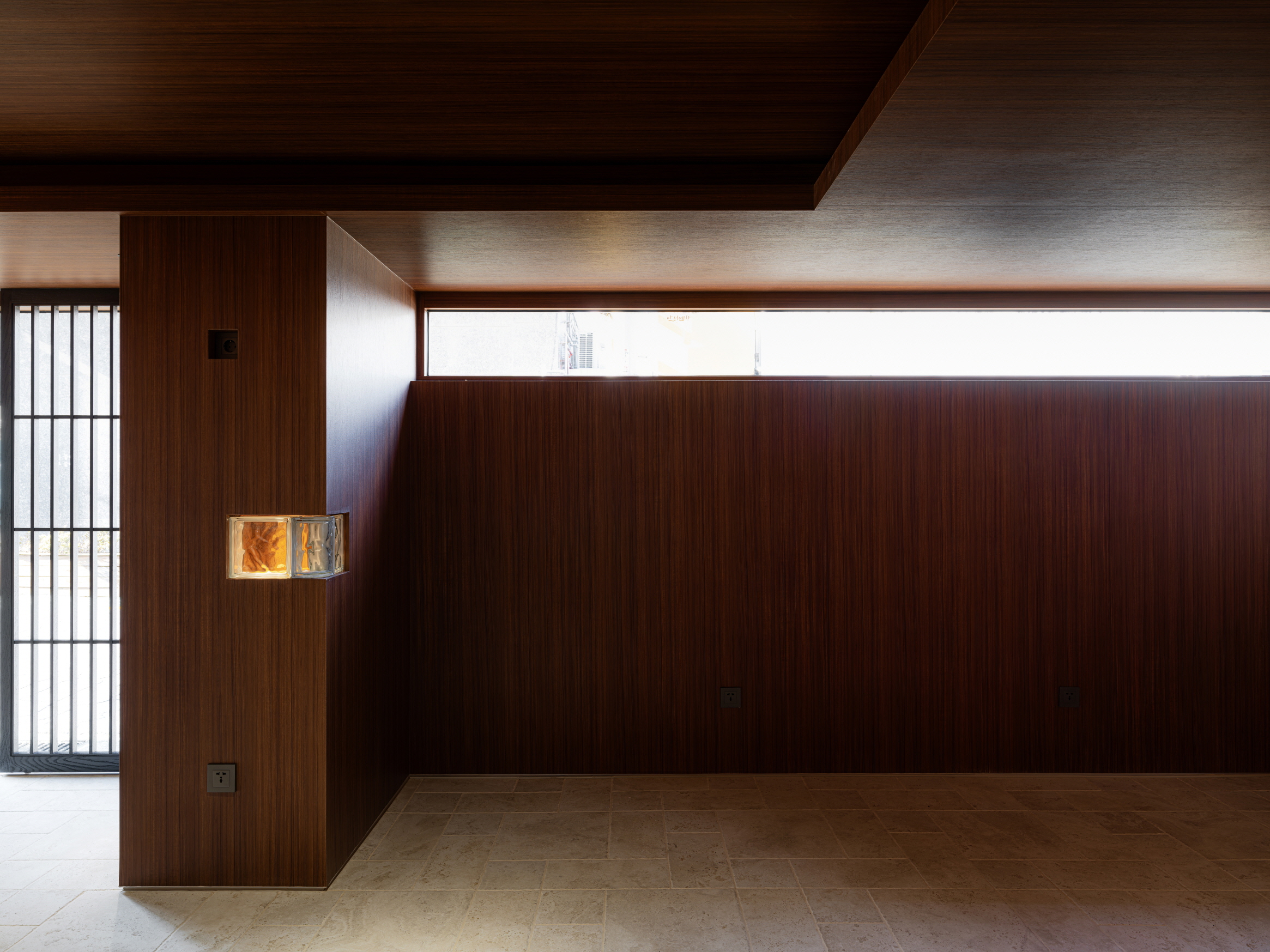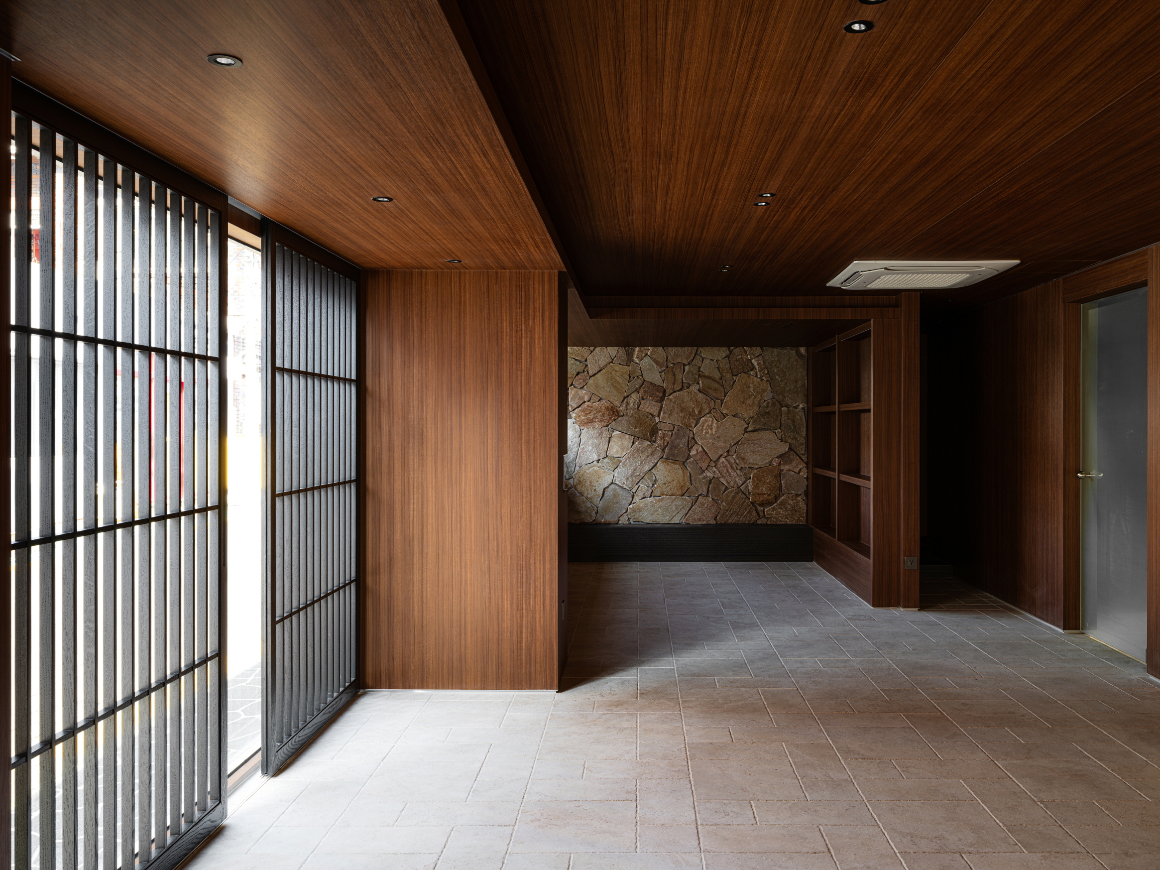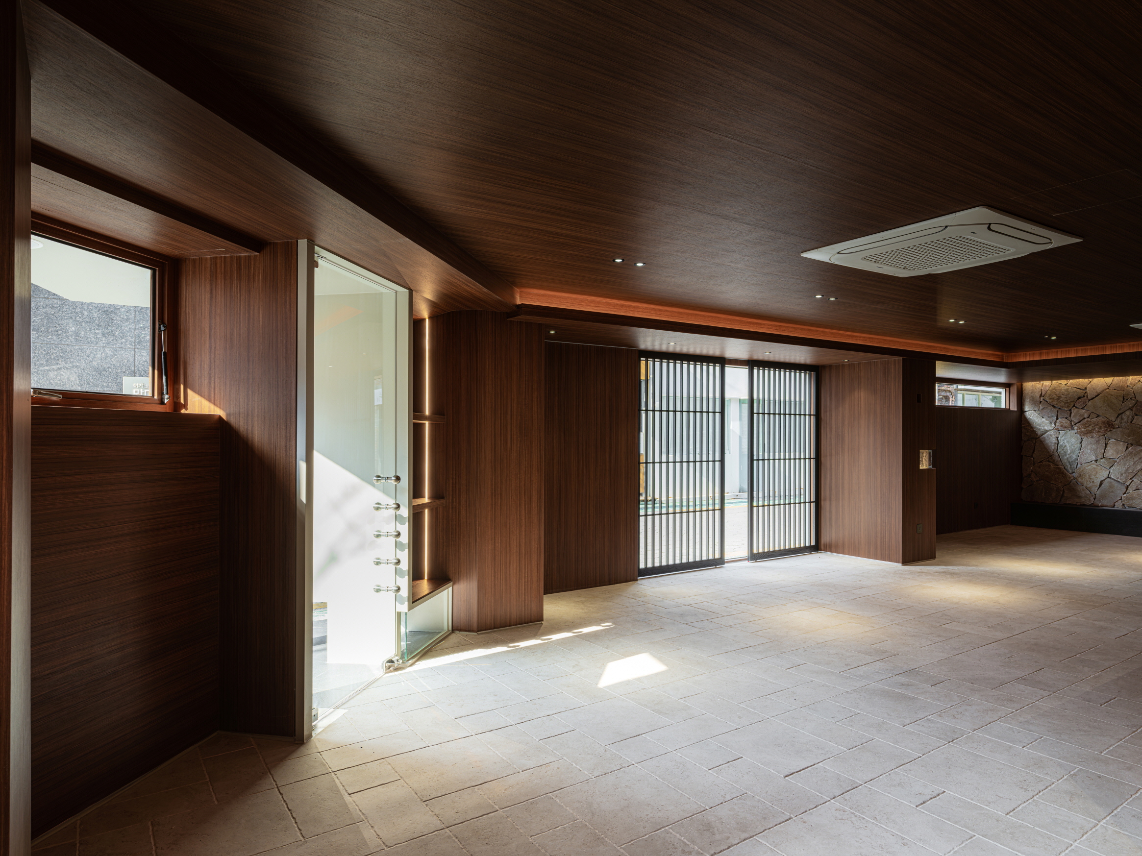 벽체와 일부 마감재에는 거친 질감의 석재(파석)를 적용해 공간에 자연스러운 텍스처를 더했습니다. 이 소재는 조명에 따라 다른 분위기를 연출할 수 있어, 시간대에 따라 달라지는 공간의 변화를 더욱 극대화하는 역할을 합니다.