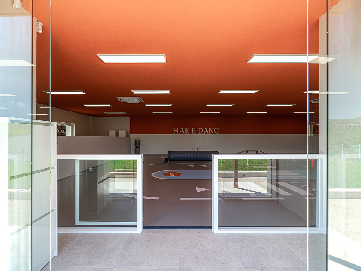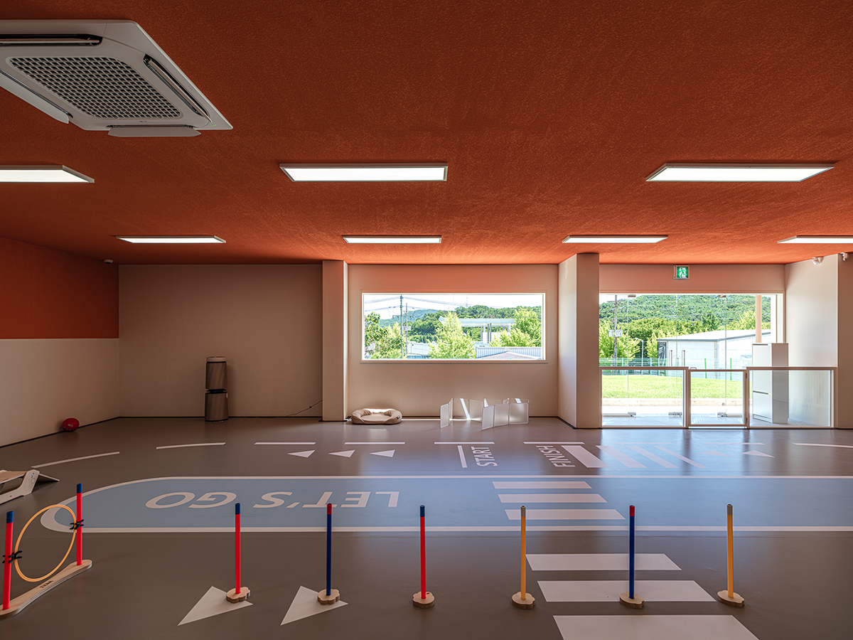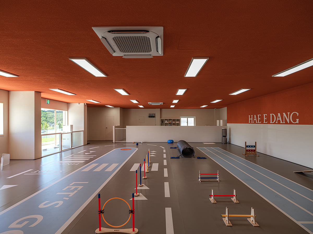 유치원동은 애견들이 넓게 뛰어 놀 수 있도록 전체를 오픈하였고, 바닥에는 트랙을 디자인해 밋밋할 수 있는 공간에 재미를 더해주었다.