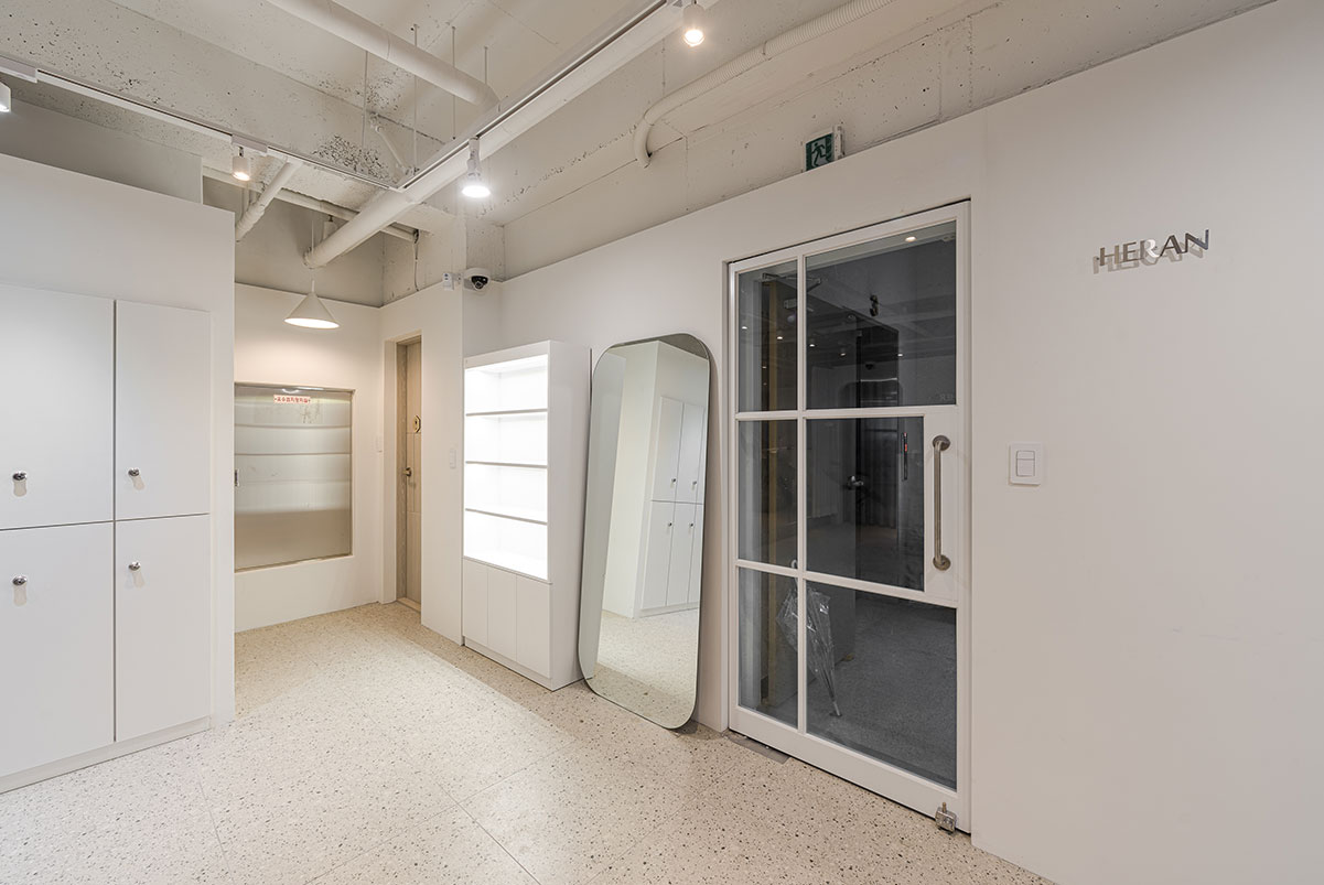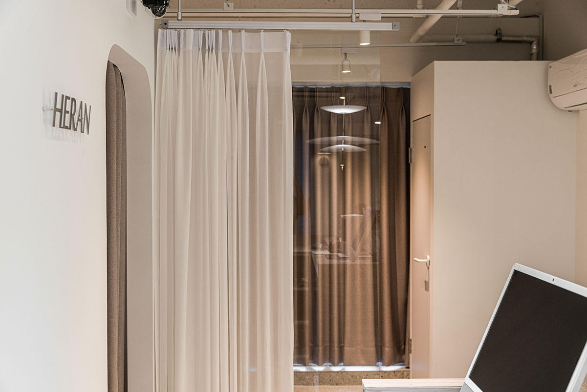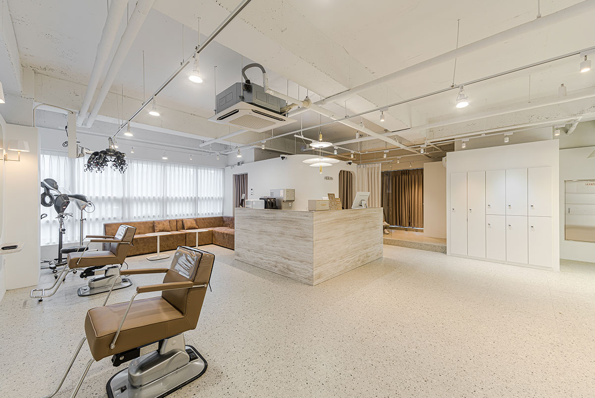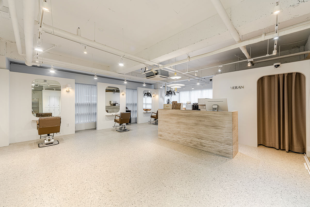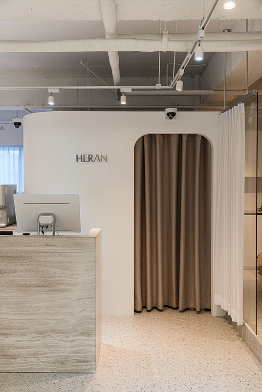 HERAN - 그녀의 편안함'이란 영어와 한문의 합성어인 상호와 같이, 방문객과 사용자가 자연스래 공간에 녹아들수 있도록, "베이스 컬러와 포인트컬러" 그리고, "직선과 곡선"의 레이어드에 초점을 맞추었다.