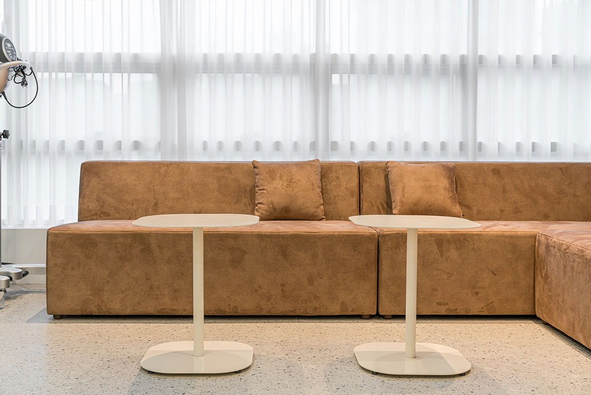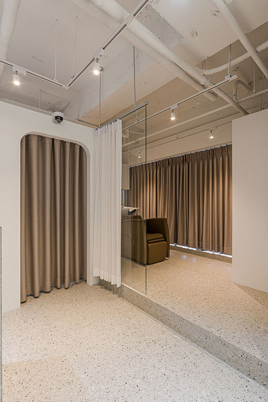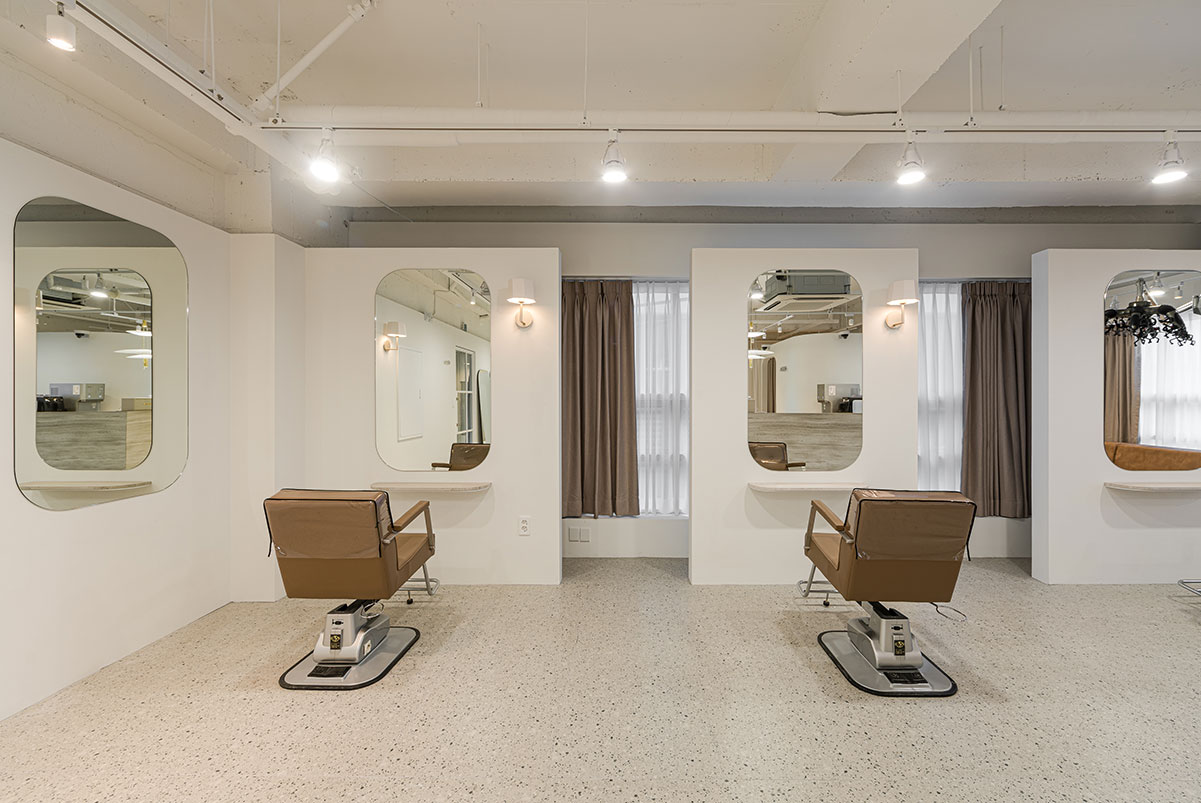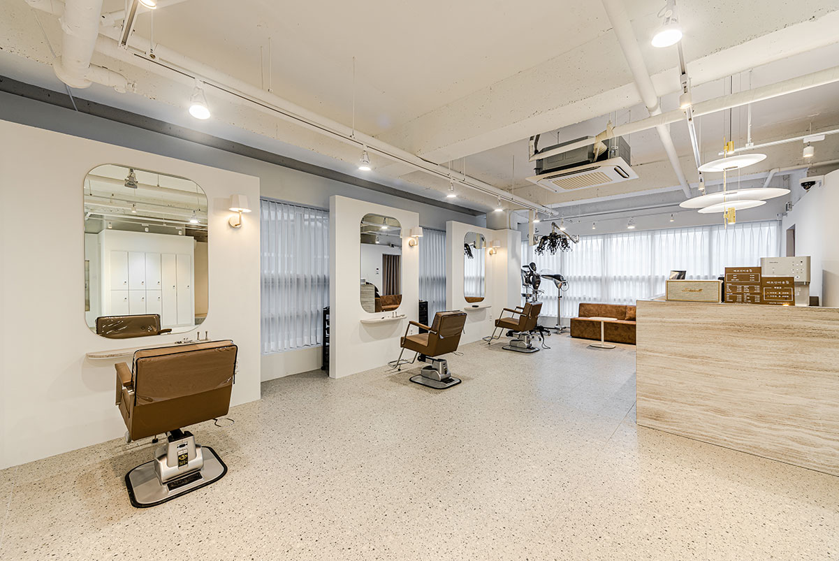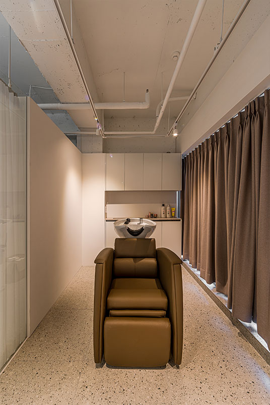 해당 건물이 위치한 곳은 반대편에 주상복합 건물이 가까이 마주하고 있어, 상가와 주거민간의 프라이버시 문제가 발생할수 있었다.내/외부 시선을 차단하면서도 공간의 2/3을 차지하는 창호에서 주는 채광의 이점을 잃지 않도록 시스루 커튼을 전체 장호에, 샴푸실의 경우 암막커튼을 스타일링하였다. 클라이언트의 오픈날짜를 맞추기 위해 해당 신축건물의 준공승인 전부터 준비하여, 8월의 태풍과 장마에도 불구 하고, 철저한 계획으로 건물의 준공과 동시에 개업을 할수 있게 해드린 의미 있는 작업이었다.